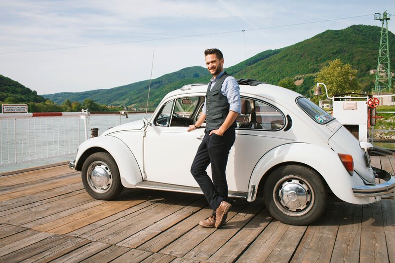 ServusTV Moderator Richard Deutinger genießt die Fahrt mit dem Oldtimer durch die Wachau.