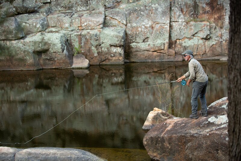 Landscape WS of Jeremy Wade casting from a rock ledge int still waters. Location: New South Wales, Australia