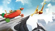Mazu, Bill, Tiny und Rocky (v.l.n.r.) wollen Giganto mit ihren neuen Rennwagen zu einem Rennen herausfordern.