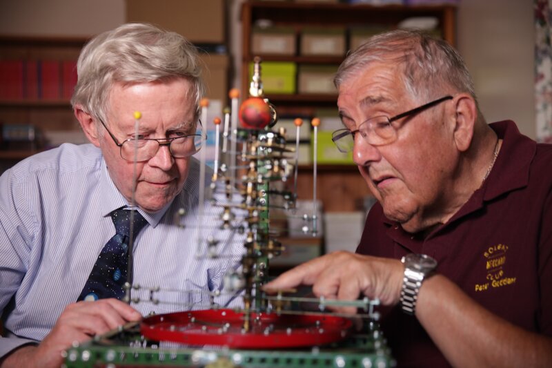 Der Engländer Michael Whiting (l.) hat seit seiner Pensionierung viel Zeit für Hobbys. Und am liebsten baut er Modelle von Planetensystemen: sogenannte Orrerys.