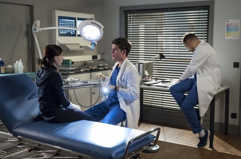 Ben Ahlbeck (Philipp Danne, M.) will mit weiteren Tests herausfinden, was Sina (Isabel Bongard, l.) fehlt. Dr. Matteo Moreau (Mike Adler, r.) hält sie für völlig gesund.