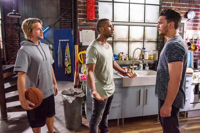 Michelle (Franziska Benz, 3.v.l.) und Finn (Christopher Kohn, 2.v.r.) gehen dazwischen, als der Streit zwischen Moritz (Tijan Njie, l.) und Ronny (Bela Klentze) wegen Chiara (Alexandra Fosnatti) eskaliert.