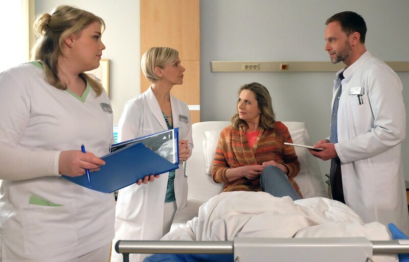 Annegret Michels (Susanne Michel, 2.v.re.) hat Zysten in der Bauchspeicheldrüse, die ziemlich gewachsen sind. Dr. Kai Hoffmann (Julian Weigend, re.) hat Dr. Kathrin Globisch (Andrea Kathrin Loewig, 2.v.li.) gebeten, diese robotergestützt in einer OP zu entfernen. li.: Schwester Miriam (Christina Petersen)