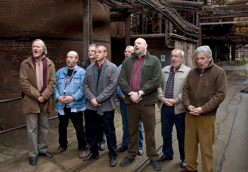 Die "Palomas", darunter Kalle Wiehr (Heinrich Giskes, li.), Heini Kamke (Dominique Horwitz, 4.v.li.) und Kumpel Scholz (Axel Häfner, 3.v.re.) singen ihrem tödlich verunglückten Kumpel ein Ständchen.