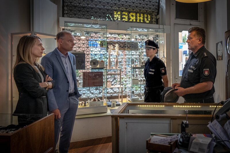 • Pinar (Aybi Era, 2.v.r.) und Hans (Bruno F. Apitz, r.) nehmen den Einbruch im Uhrengeschäft von Beate (Marisa Leonie Bach, l.) und Martin Brümmer (Christian Mock, 2.v.l.) auf.