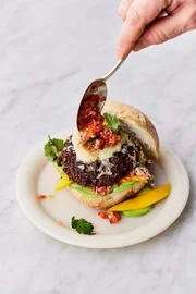 Der britische Starkoch präsentiert vegetarische Gerichte: Diesmal kocht er einen Burger aus schwarzen Bohnen, garniert mit Salsa, Mango und Avocado, sowie einen arabischen Salat mit Croûtons.