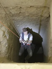 Josh Gates plummets into the darkness of an ancient Egyptian tomb.