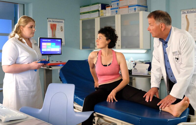 Dr. Roland Heilmann (Thomas Rühmann, re.) untersucht gerade den Fuß von Rieke Machold (Liza Tzschirner, mi.) als Schwester Miriam (Christina Petersen, re.) unverhofft in den Behandlungsraum kommt. Miriam wartet seit Wochen auf ein Zeichen von Rieke, doch nichts kam.