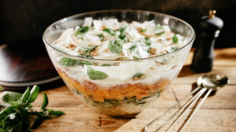 Molly Yeh bereitet Teigtaschen mit Eiern und Speck für einen Lunch mit ihrem Mann Nick auf dem Feld vor. Abends sind die beiden bei Freunden zum Potluck eingeladen. Natürlich steuert die Food-Bloggerin einige ihrer Spezialitäten zum Buffet bei: einen Salat mit Kürbis und Farro, Halva Magic Bars und heißen Erdnussbutter-Mokka.