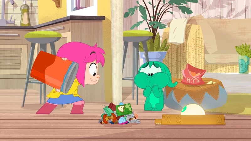 Rebecca (l.) hat einen kleinen Haufen Müll auf den Boden geschüttet, um damit den neuen Staubsauger-Roboter ihrer Mutter auszuprobieren. Ernest (r.) ist stinksauer, dass der Roboter den Müll essen darf und nicht er.