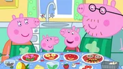 Es ist fast Mittagszeit bei Peppa zu Hause. Mama Wutz schlägt vor, gemeinsam Pizza zu machen.