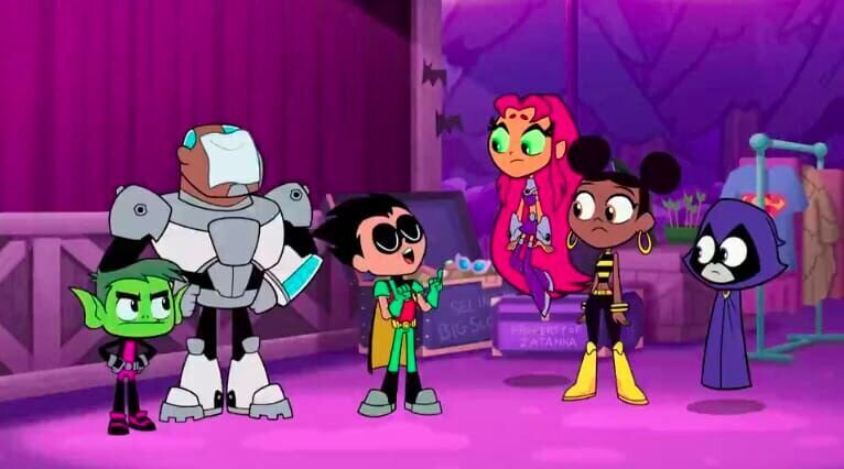 • v.li.: Beast Boy, Cyborg, Robin, Starfire, Bumblebee, Raven