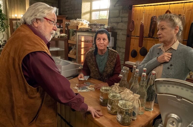 Johanna (Ursula Cantieni, re.) muss wider Willen einsehen, dass Lioba (Lisbeth Felder, Mi.) im Hofladen erfolgreich war. Hermann (Wolfgang Hepp, li.) ist ebenfalls überrascht.