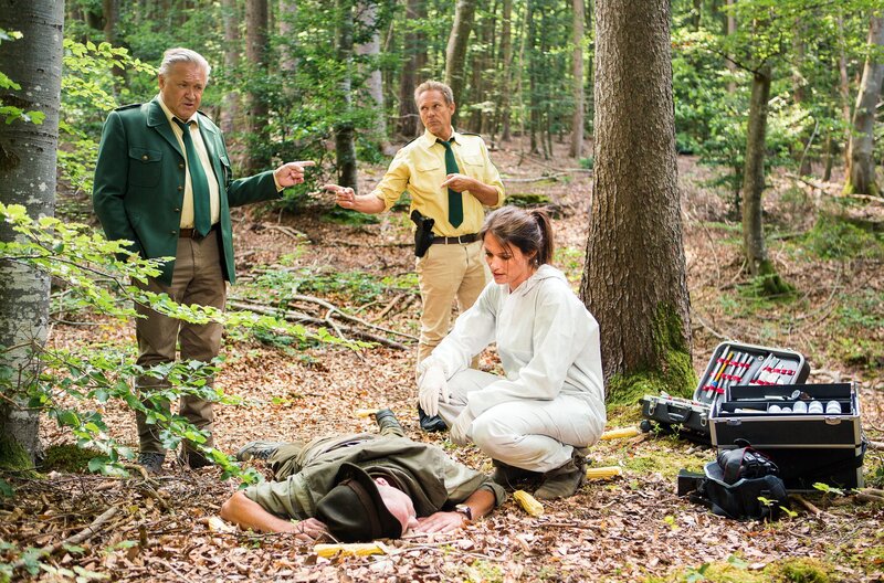 • Hubert (Christian Tramitz) und Girwidz (Michael Brandner) versuchen der Pathologin Dr. Caroline Fuchs (Susu Padotzke) zu erklären, wie sie auf die Leiche des Försters Ulf Gröschel gestoßen sind.