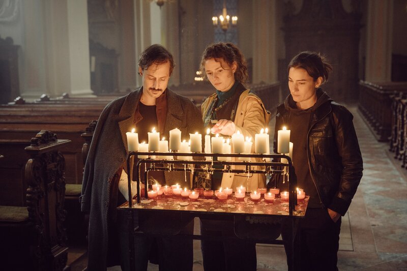Von links: Am Marienaltar entzünden Zankl (Michael Ostrowski) Mia (Nadja Sabersky) und Frederike (Marie Leuenberger) Kerzen - eine kleine Notgemeinschaft, die irgendwie zusammengehört.