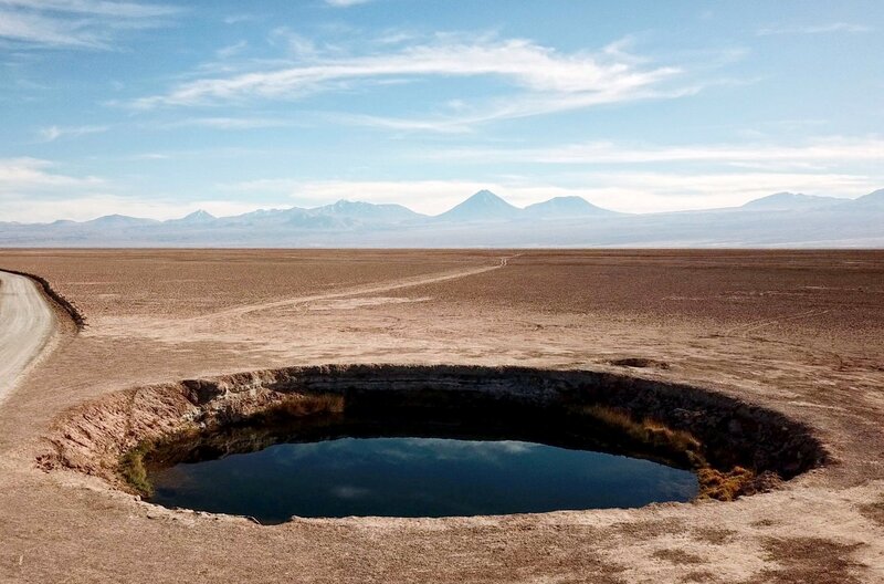 Wie ein riesiger Spiegel erscheint der kreisrunde See inmitten der Atacama-Wüste in Chile. Er gehört zu den beiden „Augen der Wüste“, den Ojos del Salar – Süßwasserseeen inmitten der trockenen Salzpfanne.