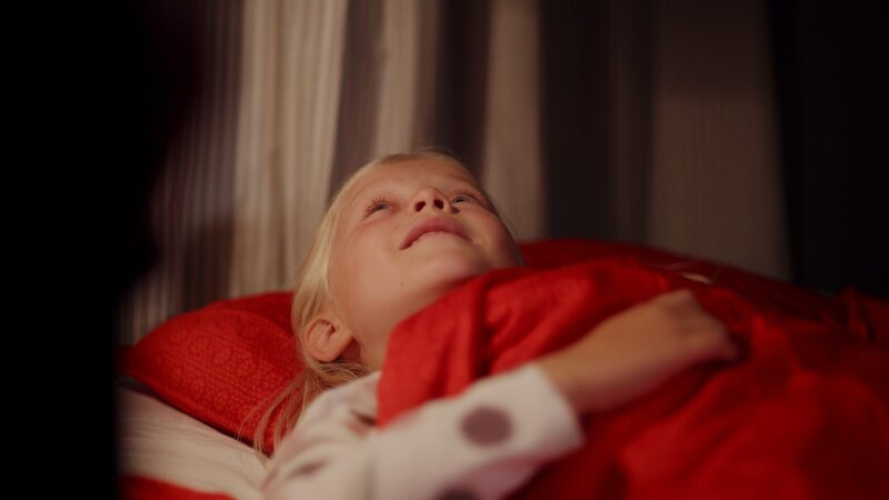 Vilda übernachtet bei Großtante Eva, weil Papa auf Geschäftsreise gehen muss. Bei Eva ist es toll! Da gibt es Abendbrot in der Badewanne. Aber als Vilda abends im Bett liegt, kann sie nicht einschlafen. Sie hat so viele Ideen: Auf dem Bett hüpfen, etwas trinken, Pipi machen gehen. Irgendwann legt sich Tante Eva neben sie, um das Einschlafen zu erleichtern und schläft als Erste ein. Vilda gibt ihr einen Kuss und schläft als Zweite ein.