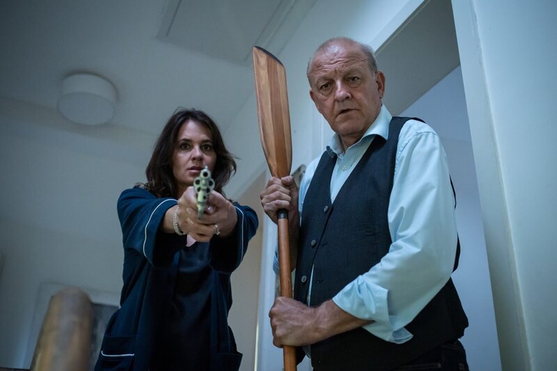 Tanja Steinthal (Stephanie Eidt) und Georg Wilsberg (Leonard Lansink) haben sich gewappnet, denn: Jemand ist im Haus.