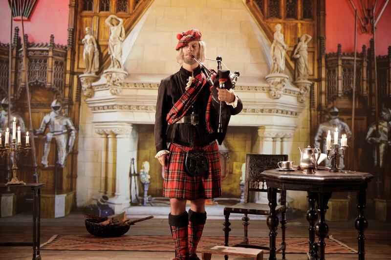 • Thomas Brezina und Ramfetz mit den Gegenständen, deren Echtheit diesmal auf dem Prüfstand steht: Geisterdudelsack, Sportschuhe für Pferde, Handyreparatur-Gummi, Menschlicher Wecker und Limonade aus Vogelspucke.