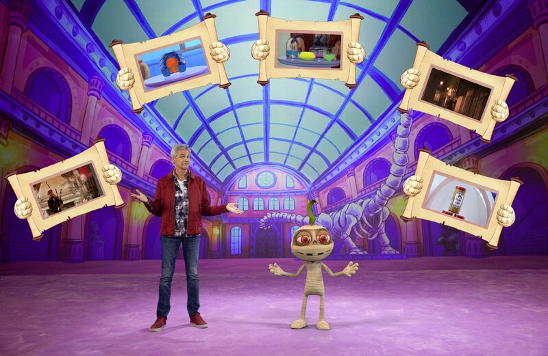 Thomas Brezina und Ramfetz mit den Gegenständen, deren Echtheit diesmal auf dem Prüfstand steht: Geisterdudelsack, Sportschuhe für Pferde, Handyreparatur-Gummi, Menschlicher Wecker und Limonade aus Vogelspucke.