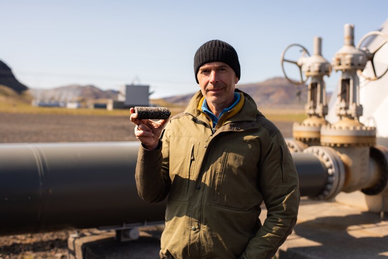 Dirk Steffens hält am Geothermalkraftwerk Hellisheiði auf Island den Beweis dafür in den Händen, dass es möglich ist, CO2 langfristig in bestimmten Gesteinen zu speichern.