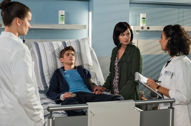 Leyla Sherbaz (Sanam Afrashteh, r.) klärt Ina Harz (Denise Zich, 2.v.r.) über mögliche Ursachen, für die Symptome bei ihrem Sohn Josha (Juls Serger, M.) auf (mit Tilman Pörzgen, l.).