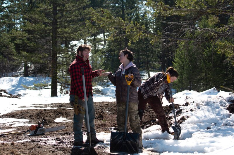• L-R: Gabriel Brown, Rain Brown, Amora "Bird" Jean clearing snow from their land.