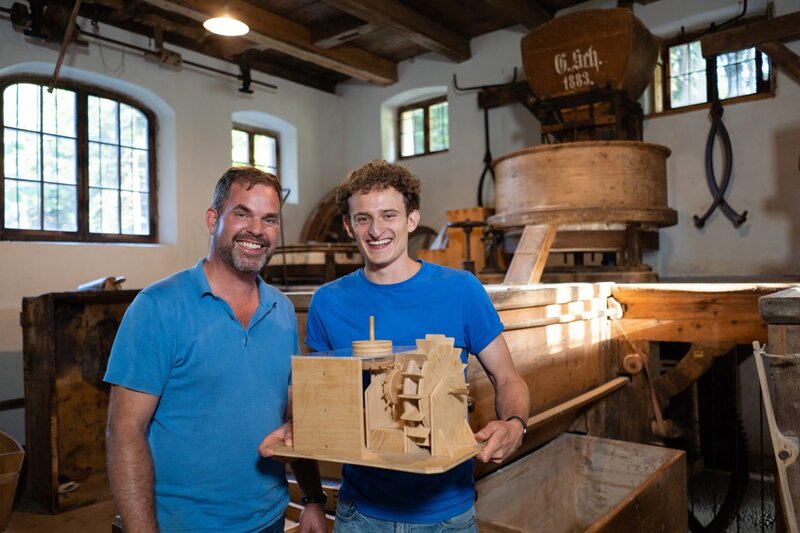 • Wie eine alte Getreidemühle funktioniert, findet Julian gemeinsam mit dem Mühlen-Experten und Historiker Jan (links) im Freilichtmuseum Glentleiten heraus.