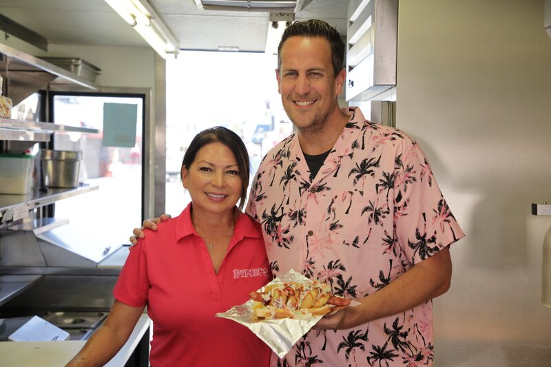 In Kalifornien verkostet Noah Cappe einen Zwiebelring-Hotdog.