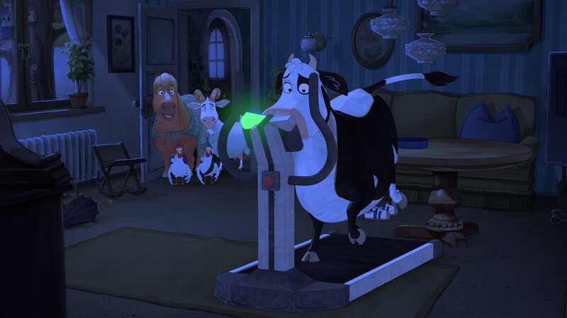 Lieselotte späht durchs Fenster und sieht, wie die Bäuerin mit einem Gruselmoster zu kämpfen scheint. Dass die Bäuerin nur ihr neues Laufband testet, weiß die Kuh Lieselotte nicht. Voller Panik stürmt sie los und schmiedet Pläne, wie sie die geliebte Bäuerin befreien kann. Lieselotte nimmt all ihren Mut zusammen und stellt sich dem seltsam blinkenden Etwas. Mithilfe der Freunde findet sie heraus, dass es eine Maschine mit vielen Knöpfen ist.