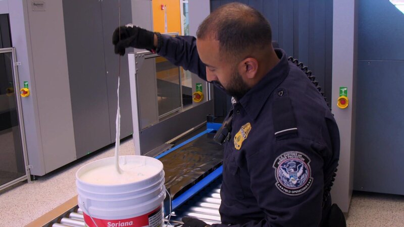 Haben Schmuggler eine illegale Substanz im Farbeimer versteckt? Grenzbeamte prüfen den Verdacht genau.
