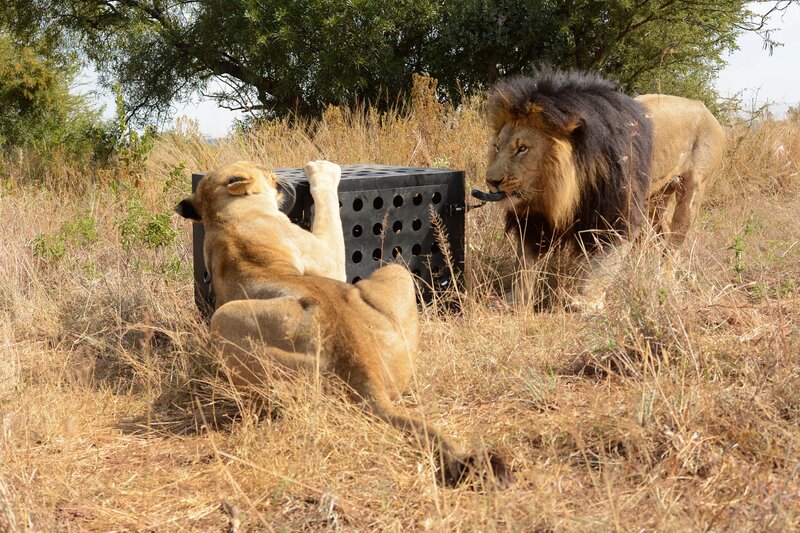 Vermeintliche Beute - Eine Löwin attackiert eine Kudu-Attrappe aus Karton.