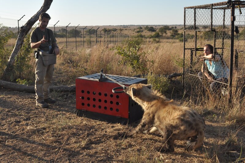 Kevin Richardson und Dr. Christine Drea beobachten eine Hyäne wie sie versucht die Verriegelung einer Versuchsbox zu öffnen.