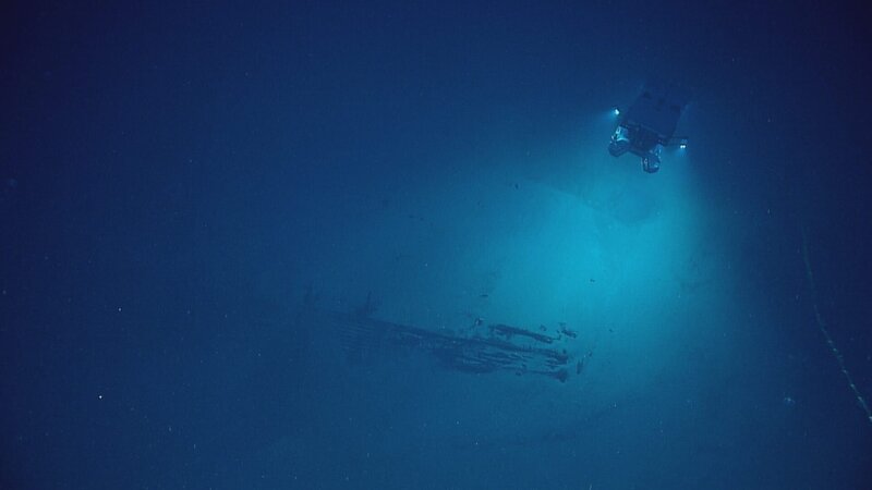 • Ein NOAA ROV inspiziert das intakte Flügelteil eines B29-Flugzeugs in 350 m Tiefe während einer Inspektion des Marianas-Grabens.