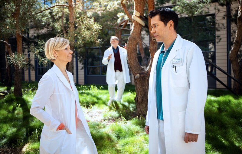 • Dr. Globisch (Andrea Kathrin Loewig, li.) hat den Grund für Hans-Peter Brenners (Michael Trischan, mi.) herausgefunden. Sie bittet Dr. Brentano (Thomas Koch, re.) auf ihn aufzupassen und sich um ihn zu kümmern.