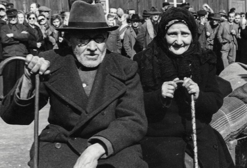 Ein älteres sudetendeutsches Ehepaar bei seiner Ankunft in Bayern