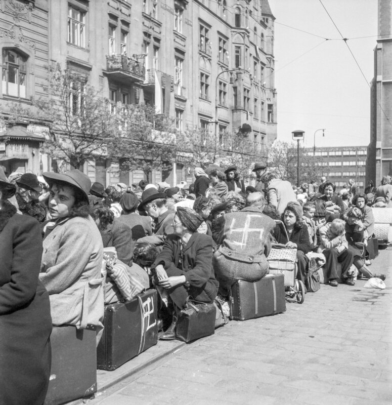 Sudetendeutsche, die im Mai 1945 in Prag auf die Ausreise aus der Tschechoslowakei warten.