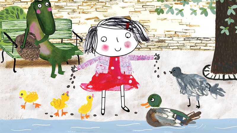 Am See Rita und das Krokodil gehen an den See, um die Vögel zu füttern. "Nicht das Brot essen, Krokodil!" Es gibt Enten, Gänse, Spatzen und Schwäne. Und es gibt Tauben. "Die füttern wir nicht". Aber alle schönen Vögel fliegen weg und nur die Taube frisst. Vielleicht ist die Taube doch der beste Vogel?...