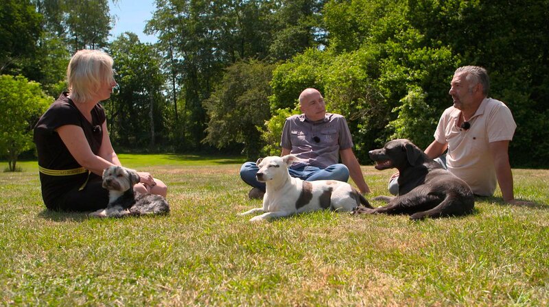 • Hundehalter Sabine (l) und Jörg treffen mit ihrem Hund Ronja auf Coach Andreas Ohligschläger (r), der zwei seiner Hunde mitgebracht hat.