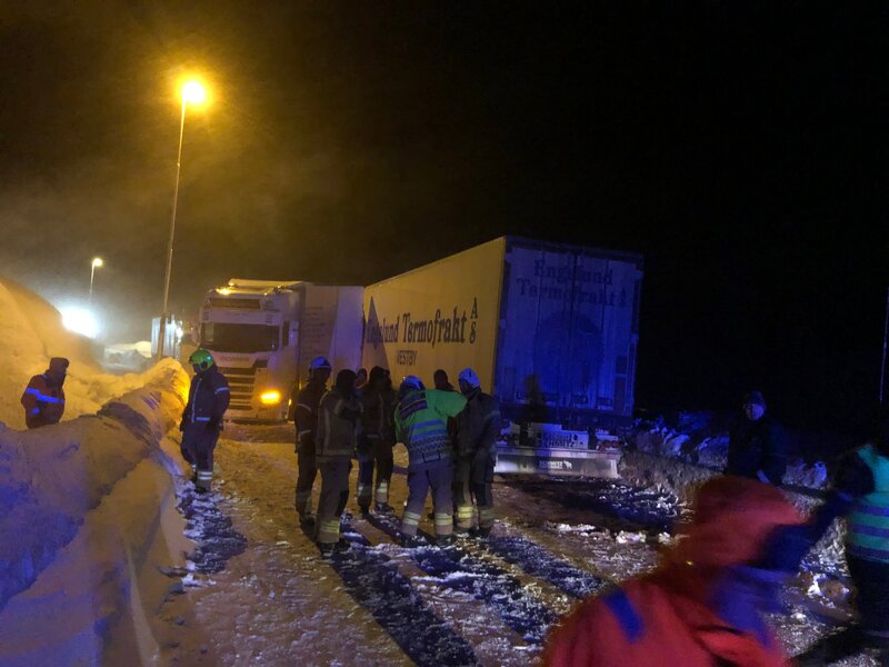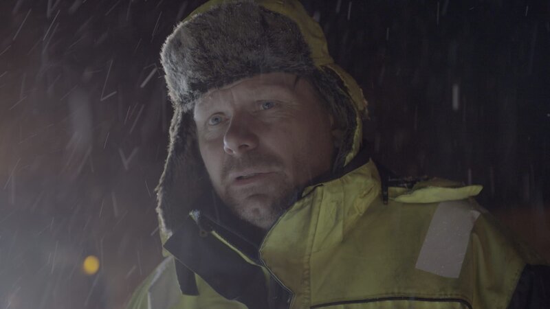 Thord und Erlend schneiden dem Dänen die Ketten ab und befestigen sie. Der dänische Fahrer hat Ice Road Rescue gesehen und fragt sich, wie Thord es schafft, in der Kälte ohne Handschuhe zu arbeiten.