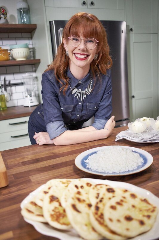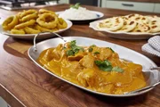 Mary serviert ein cremiges Kokos-Butter-Hühnchen, feine Zwiebelringe und eisiges Mango-Kulfi.