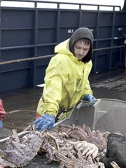Deckhand Matt Bradley helps to sort king crab on the Saga.