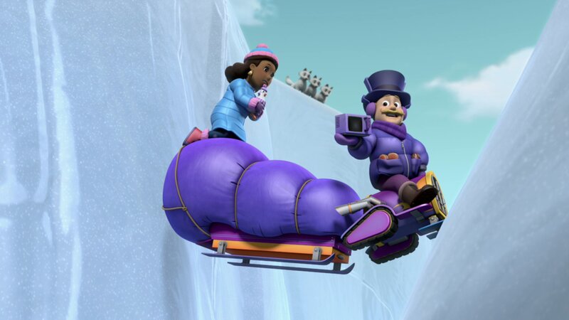 Bürgermeister Goodway und Humdinger sind im Eis gefangen. Die mutigen Helfer auf vier Pfoten eilen herbei, um ihnen zu helfen.