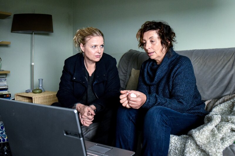 Vera Lanz (Katharina Böhm, l.) und Marion Fest (Teresa Harder, r.) schauen sich eine Videoaufnahme an.
