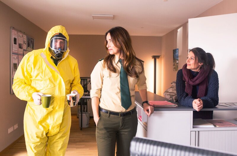 ARD HUBERT OHNE STALLER FOLGE, IX. Staffel, Folge 142, "Eine Leiche zum Kaffee", am Mittwoch (16.12.20) um 18.50 Uhr im Ersten. Girwidz (Michael Brandner, l.) hat panische Angst sich mit einer tödlichen Krankheit infiziert zu haben. Sabine Kaiser (Katharina Müller-Elmau, M.) und Dr. Fuchs (Susu Padotzke, r.) halten Girwidz für einen Hypochonder.