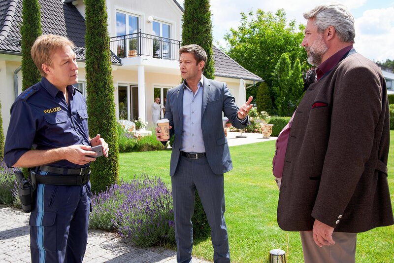 Polizeihauptmeister Mohr (Max Müller, l.) informiert die Kommissare Hansen (Igor Jeftić, M.) und Stadler (Dieter Fischer, r.) über die ersten Ermittlungsergebnisse im Zusammenhang mit dem Mord an der Hotelbesitzerin Zita Waldner.