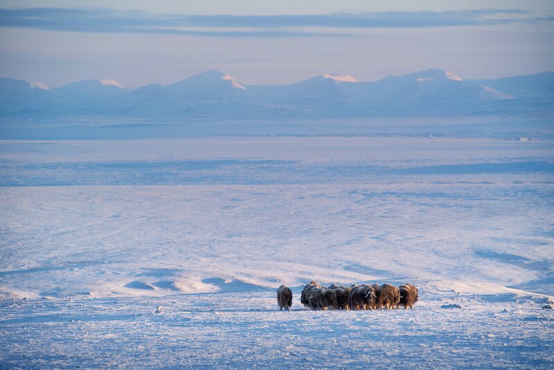 • Moschusochsen sind Kältespezialisten: Die Polarnacht in Ellesmere Island ohne Sonnenlicht dauert mehrere Monate.
