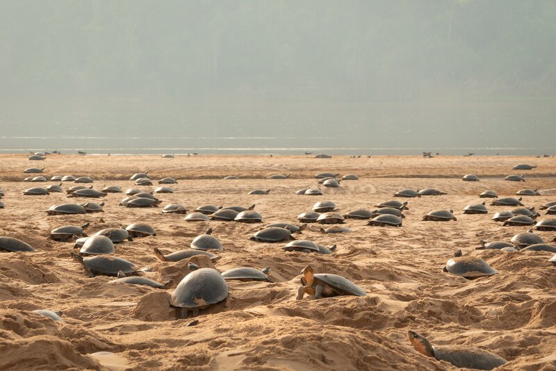Die Weibchen der Meeresschildkröte erklimmen einmal im Jahr die Sandbänke des Amazonas, um ihre Eier zu legen. In der Vergangenheit funktionierte ihr Timing perfekt, und die Jungen schlüpften, bevor die Regenzeit die Nester überschwemmte. Durch die Veränderung des weltweiten Klimas beginnt es jedoch immer früher zu regnen, und viele Jungtiere ertrinken jedes Jahr in ihren Sandhöhlen.