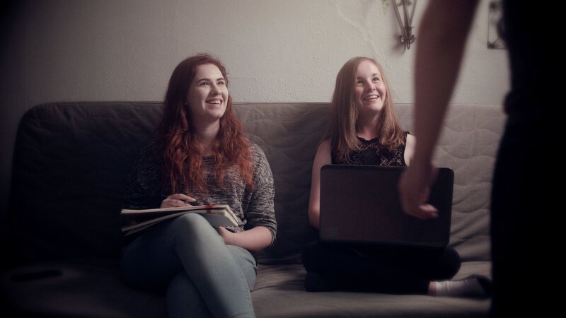 Zwei Mädchen sitzen auf der Couch und schauen lächelnd auf die Person vor ihnen.