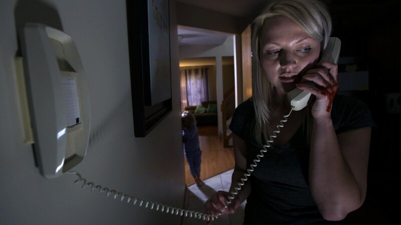 Eine Frau hält ein Festnetztelefon mit blutigen Händen und spricht